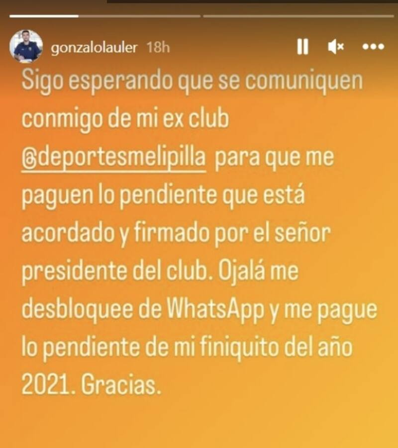 En su cuenta de Instagram, Lauler expuso el caso: "Sigo esperando que se comuniquen conmigo de mi exclub, Deportes Melipilla, para que me paguen lo pendiente, que está acordado y firmado por el señor presidente del club. Ojalá me desbloquee de Whatsapp y me pague lo pendiente de mi finiquito del año 2021", expresó el jugador.