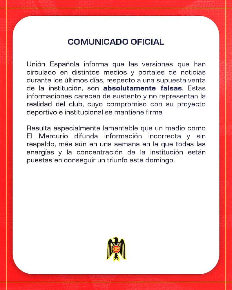 En sus plataformas digitales, Unión Española aseguró que las versiones de una venta eran absolutamente falsas y, de paso, lamentó que se haya esparcido un rumor de ese tipo.