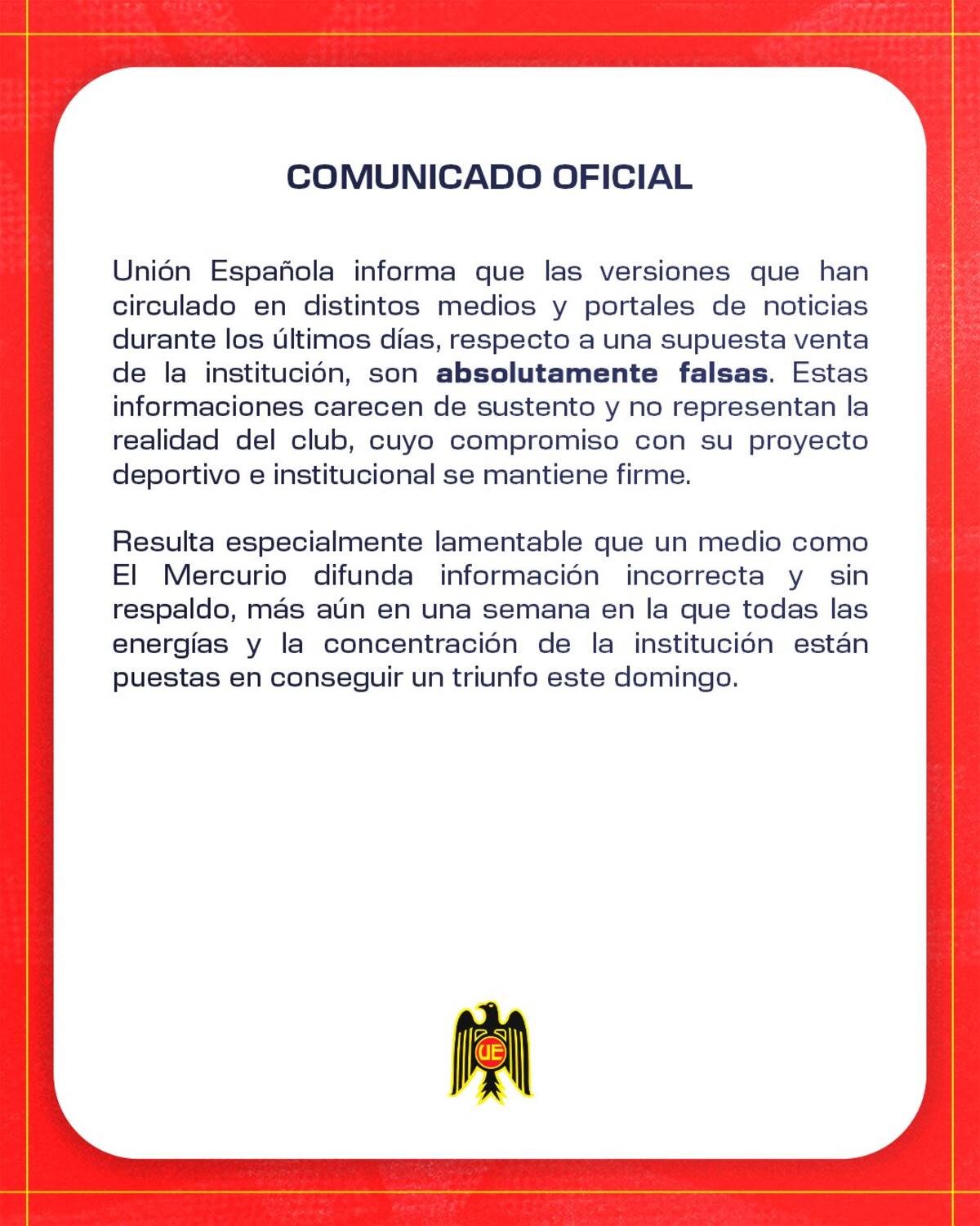 En sus plataformas digitales, Unión Española aseguró que las versiones de una venta eran absolutamente falsas y, de paso, lamentó que se haya esparcido un rumor de ese tipo.