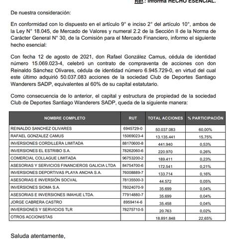 Esta jueves, Reinaldo Sánchez dio un paso importantísimo y adquirió la compra del porcentaje mayoritario (60%) de las acciones de Santiago Wanderers. Su equipo jurídico estuvo reunido con representantes del cuadro porteño en la notaría Rehbein de Viña del Mar, para afinar los detalles finales de la operación.
