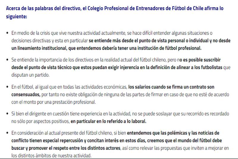 Además, desde la institución invitaron a evitar ese tipo de polémicas. “En consideración al actual presente del fútbol chileno, si bien entendemos que las polémicas y las noticias de conflicto tienen especial repercusión y concitan interés en estos días, creemos que el mundo del fútbol debe buscar y promover el respeto entre los distintos actores, así como relevar las propuestas que inviten a mejorar en los distintos ámbitos de nuestra actividad”.