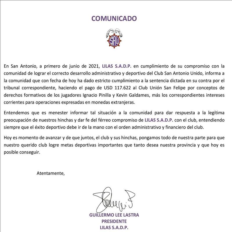 "Informa a la comunidad que con fecha de hoy ha dado estricto cumplimiento a la sentencia dictada en su contra por el tribunal correspondiente, haciendo el pago de USD 117.622 al Club Unión San Felipe por conceptos de derechos formativos de los jugadores Ignacio Pinilla y Kevin Galdames", indicaron.