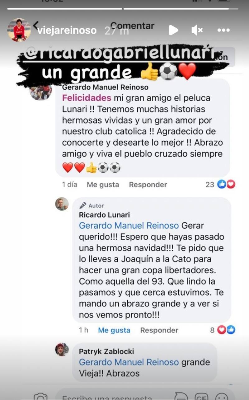 "Te pido que lo lleves a Joaquín (Larrivey) a la Cato para hacer una gran Copa Libertadores, como aquella del 93'", expresó Lunari. A su vez, recordó dicha competencia internacional, donde la UC estuvo cerca de tocar la Libertadores, dos años después de lo logrado por Colo Colo. "Que lindo la pasamos y que cerca que estuvimos", expresó el ídolo de los "Cruzados" a través de redes sociales.
