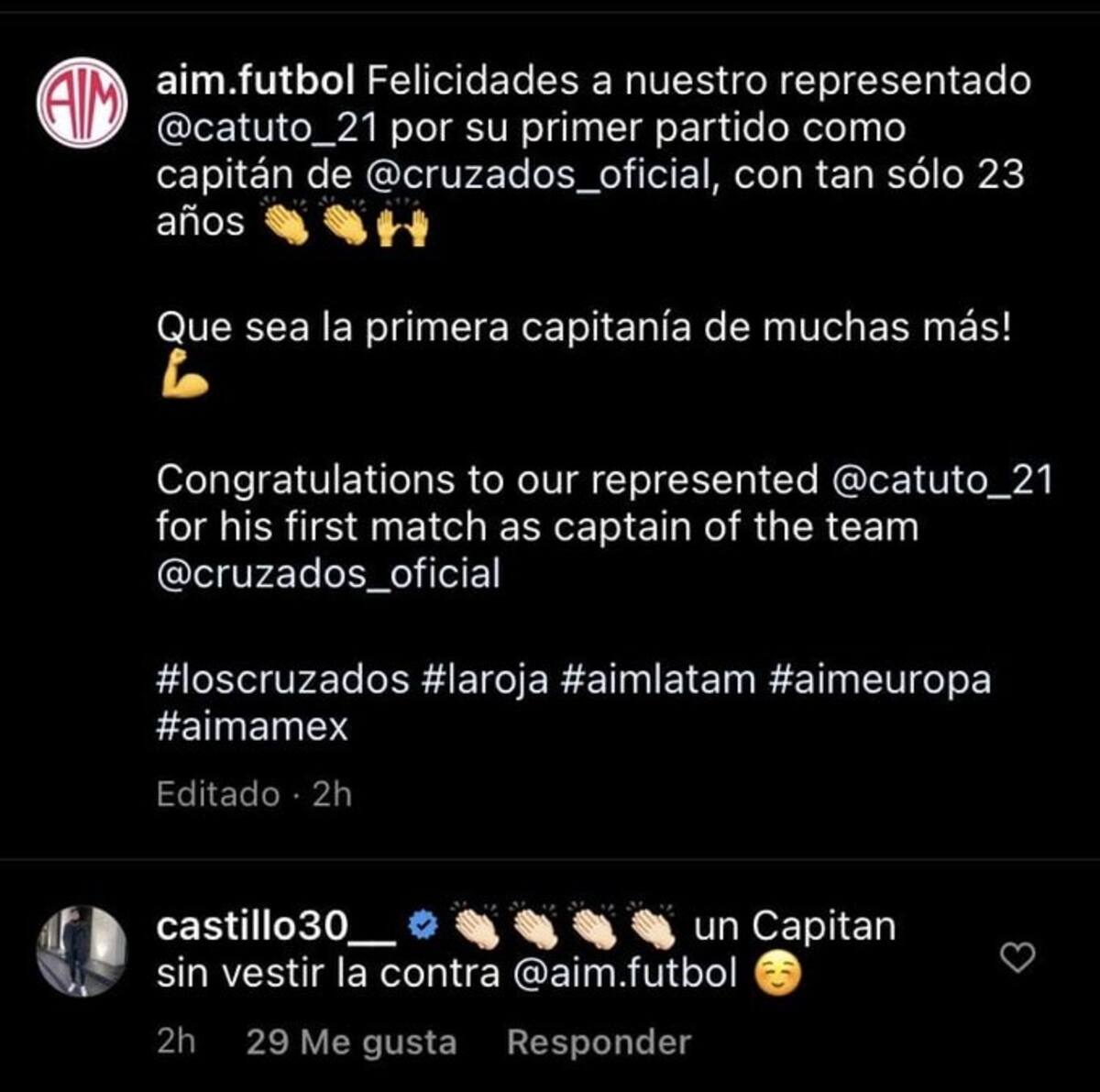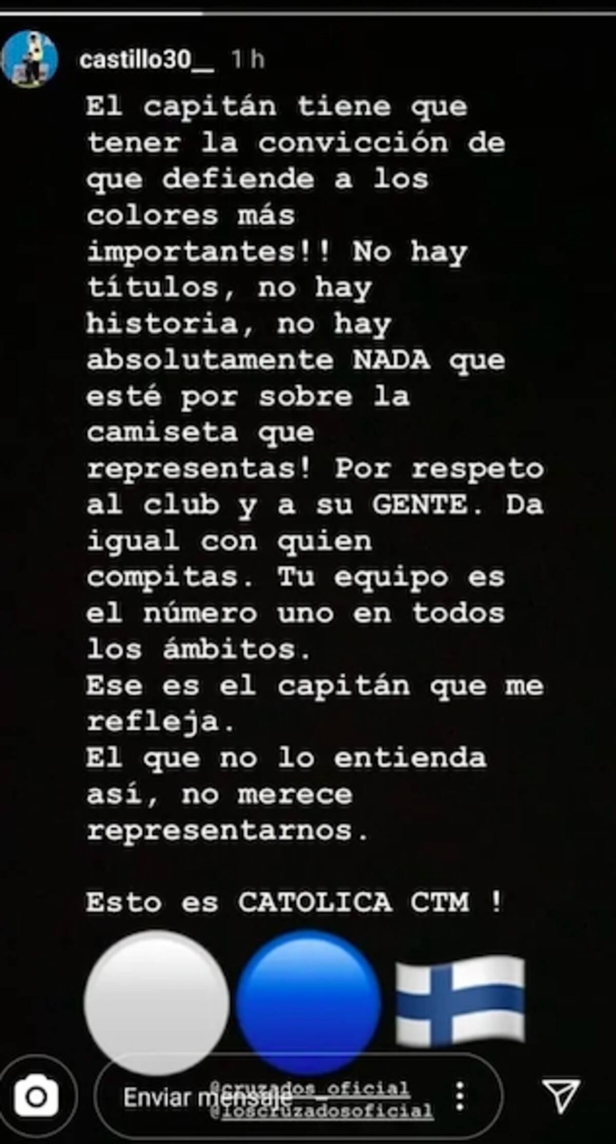 El mismo año, pero en diciembre, comentó una publicación de felicitaciones a Raimundo Rebolledo por su primer partido como capitán de U. Católica. En aquella oportunidad, Castillo comentó: “Un capitán sin vestir la contra”.