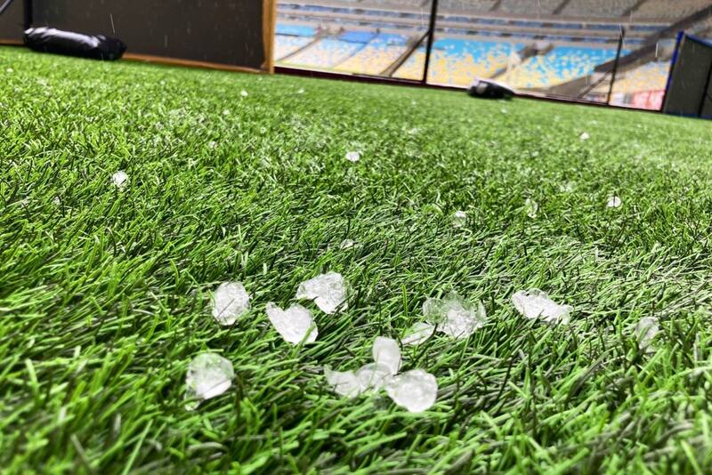 La propia cuenta del popular estadio publicó fotos con la cancha con pedacitos de hielo y, lo que es peor, este fenómeno climatológico continuará, y el partido de los "Cruzados" ante el "Mengao" está destinado a jugarse bajo un intenso aguacero.