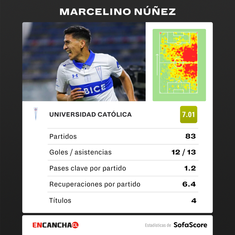 A los 22 años, esta es la tercera temporada de Marcelino Núñez como parte del primer equipo de Universidad Católica, siendo parte importante en las dos últimas campañas de los "Cruzados" dentro de su histórico tetracampeonato de Primera División.