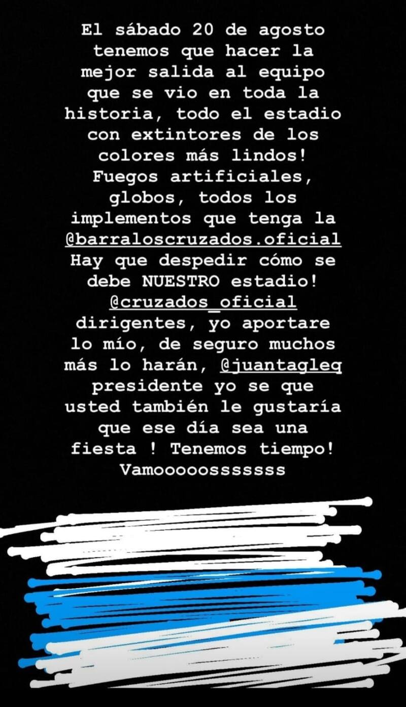 "Tenemos que hacer la mejor salida al equipo que se vio en toda la historia. Todo el estadio con extintores de los colores más lindos, fuegos artificiales, globos, todos los implementos que tenga la barra", comenzó diciendo.