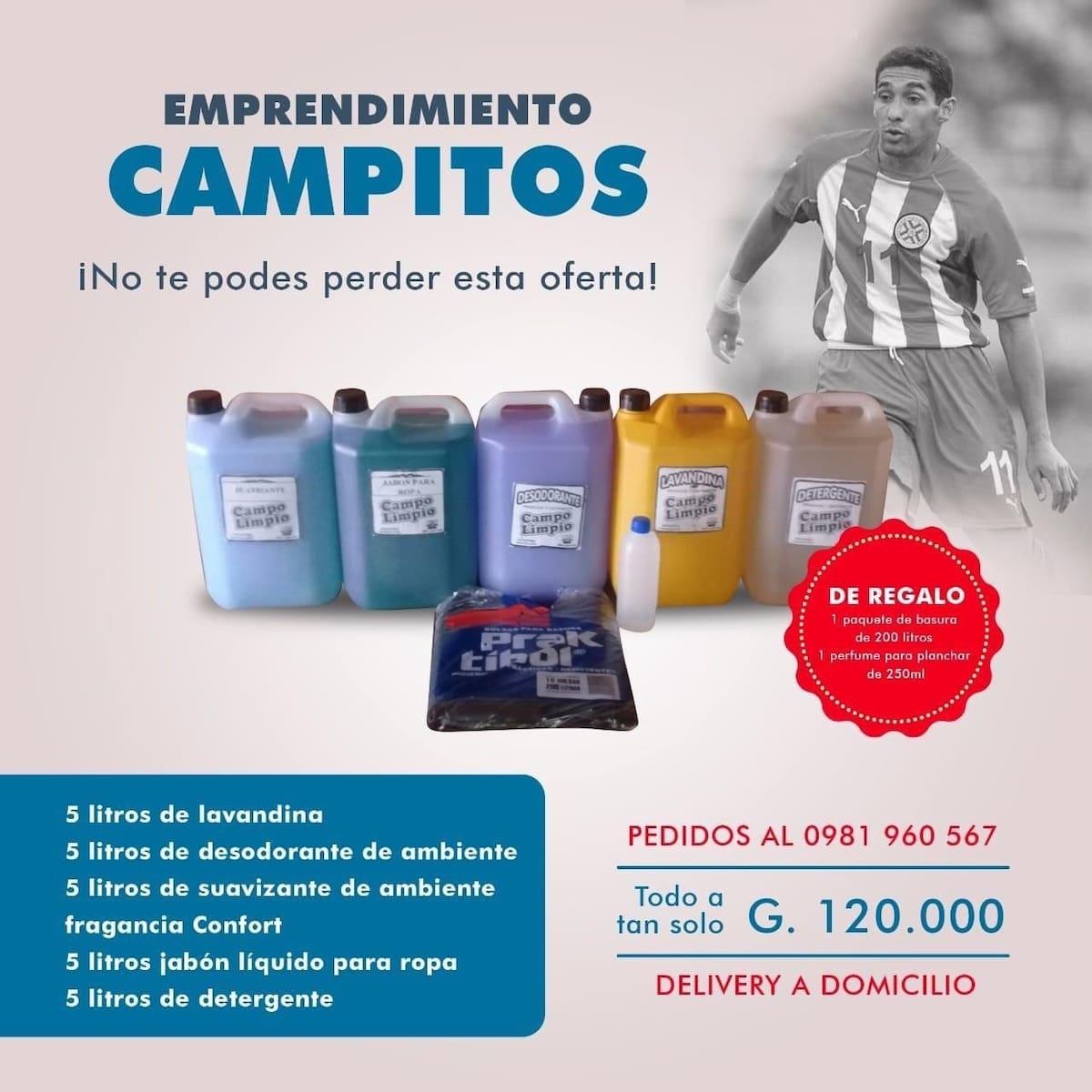El futbolista hizo noticia hace unos años, ya que parece que dejó atrás el fútbol y comenzó con un emprendimiento de productos de limpieza. "Cinco litros de lavandina, como de desodorante y también suavizante de ambiente, misma cantidad de jabón líquido y de detergente todo a tan solo 120.000 guaraníes", era parte del afiche de los productos llamados "Emprendimiento Campitos".