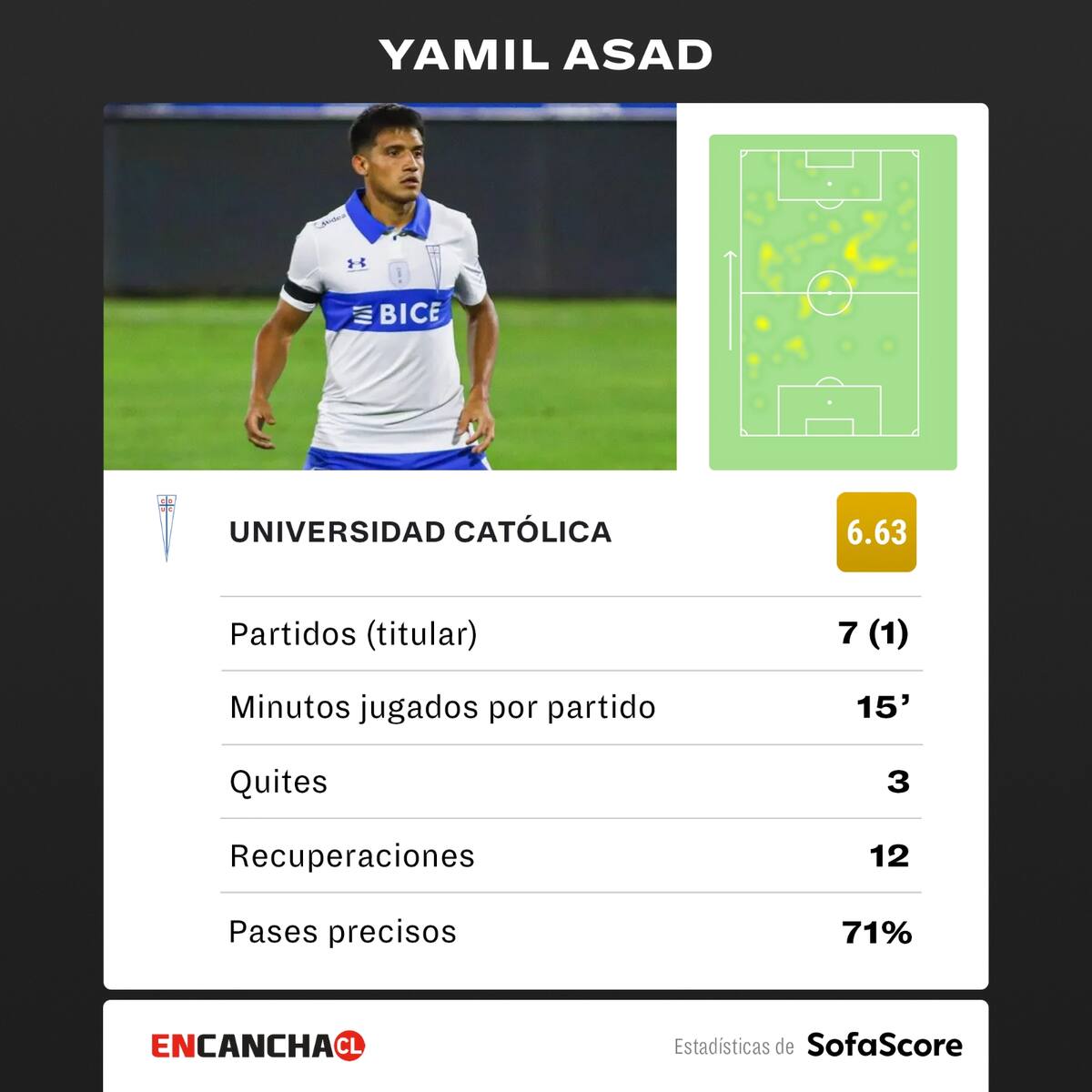 Y aunque todo parezca alegría en San Carlos de Apoquindo, hay un jugador que no la está pasando bien: Yamil Asad. El "Turco" no juega desde el 30 de julio, en la agónica victoria ante Cobresal en Las Condes. De ahí en más, el argentino no fue considerado -mayoritariamente por lesión-, lo que ha hecho que su crédito en la precordillera se debilite.