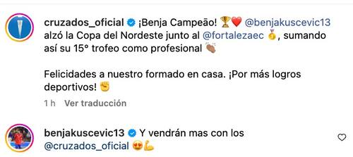 Consumada la victoria del equipo de Benjamín Kuscevic sobre el CRB de Maceió, la UC publicó en su cuenta de Twitter un mensaje especialmente dedicado al defensor. “¡Benja Campeāo! Benjamín Kuscevic alzó la Copa del Nordeste junto al Fortaleza FC, sumando así su 15° trofeo como profesional. Felicidades a nuestro formado en casa. ¡Por más logros deportivos!”, se leía en el posteo.