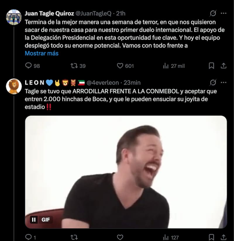 A partir de ese mensaje llegó la crítica de un hincha anónimo de la U, quien lo acusó de “arrodillarse ante Conmebol” para permitir el ingreso de 2.000 fanáticos xeneizes.