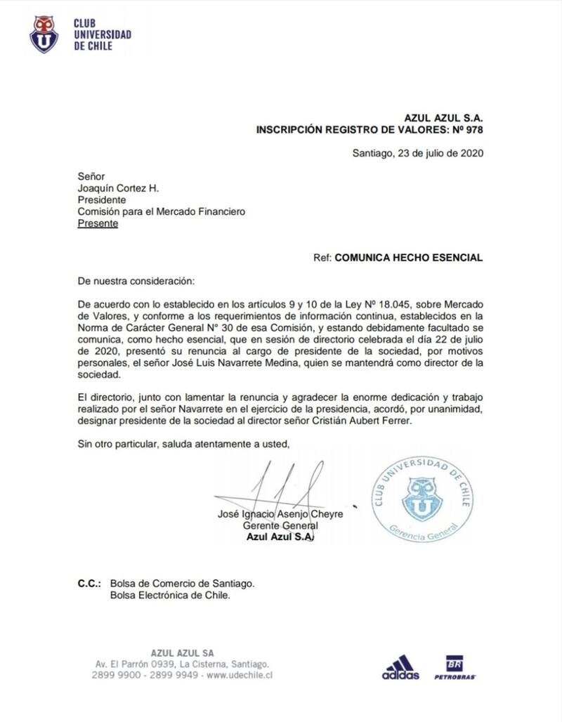 Además, oficializaron a Cristián Aubert como su sucesor: "El directorio, junto con lamentar la renuncia y agradecer la enorme dedicación y trabajo realizado por el señor Navarrete en el ejercicio de la presidencia, acordó, por unanimidad, designar presidente de la sociedad al director Cristián Aubert Ferrer".