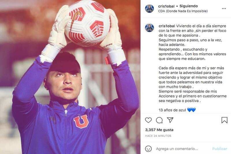 A través de sus redes sociales, el segundo portero de la U, Cristóbal Campos, publicó una imagen con un enigmático texto. El novel jugador, entre líneas, expresó sus sentimientos hacia su situación en el club, donde se rumoreó una posible salida a mediados de 2022, período donde termina su contrato. "13 años de azul. Valorando que estoy en casa, haciendo lo que amo. Espero sean muchos más", fue parte del mensaje del canterano.