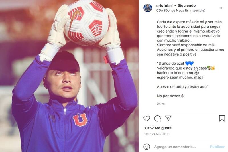 A su vez, el arquero de 22 años, que en el texto principal aludió al compromiso y al trabajo que ha llevado en su corta carrera, no se detuvo ahí. El formado en la U finalizó el mensaje con un extracto de una canción de la barra universitaria y expresó que el dinero no es lo que lo mantiene en el club. "A pesar de todo, yo estoy aquí. No por pesos, $", lanzó Campos.