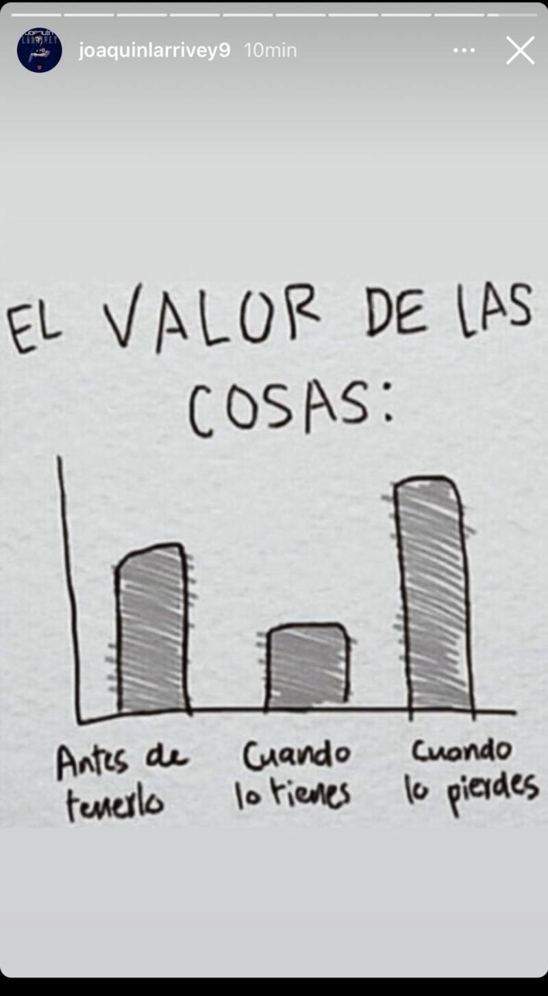 Y en medio de las fiestas de Navidad, el "Bati" subió una curiosa imagen a sus historias de Instagram, donde aparece un gráfico de barras con la frase "el valor de las cosas", siendo el resultado más alto "cuando lo pierdes", por sobre "antes de tenerlo" y "cuando lo tienes".