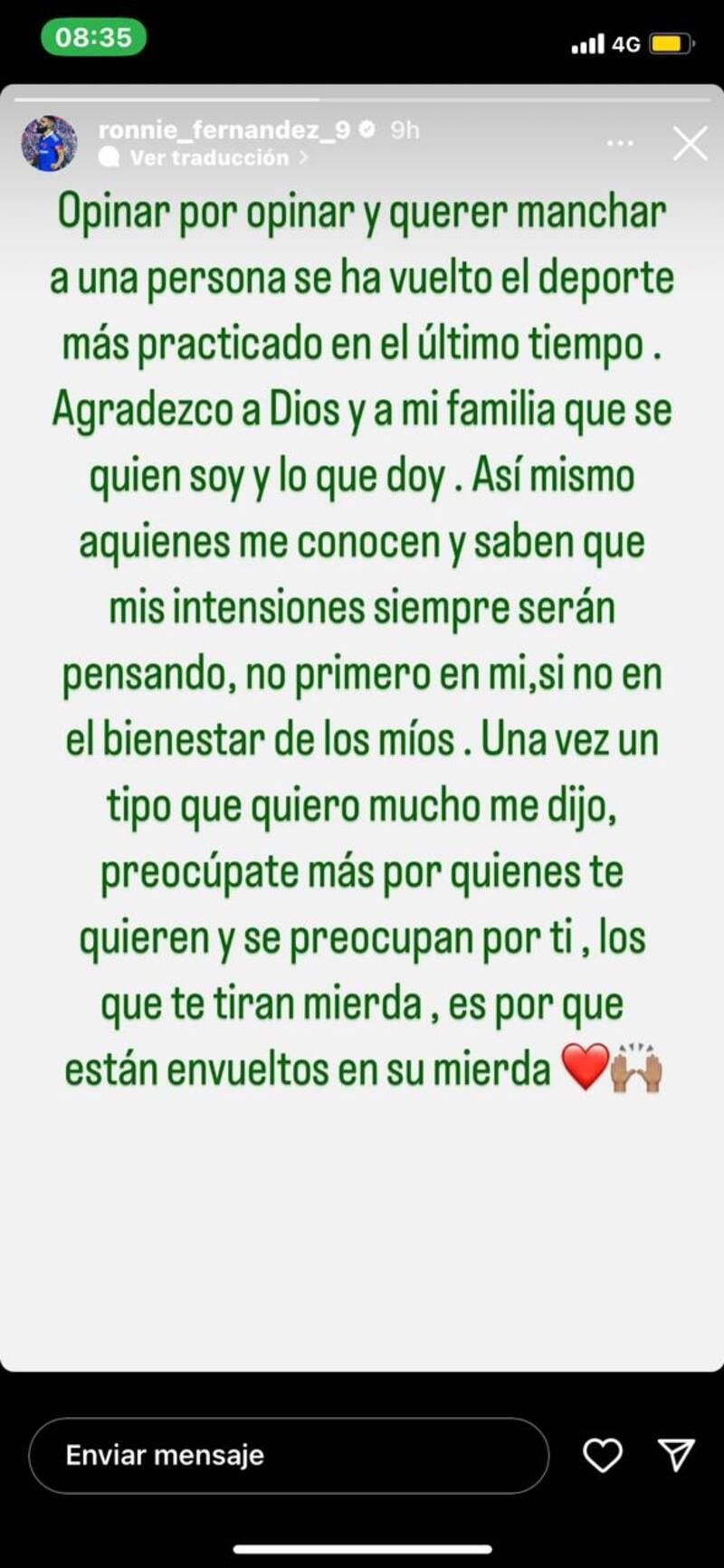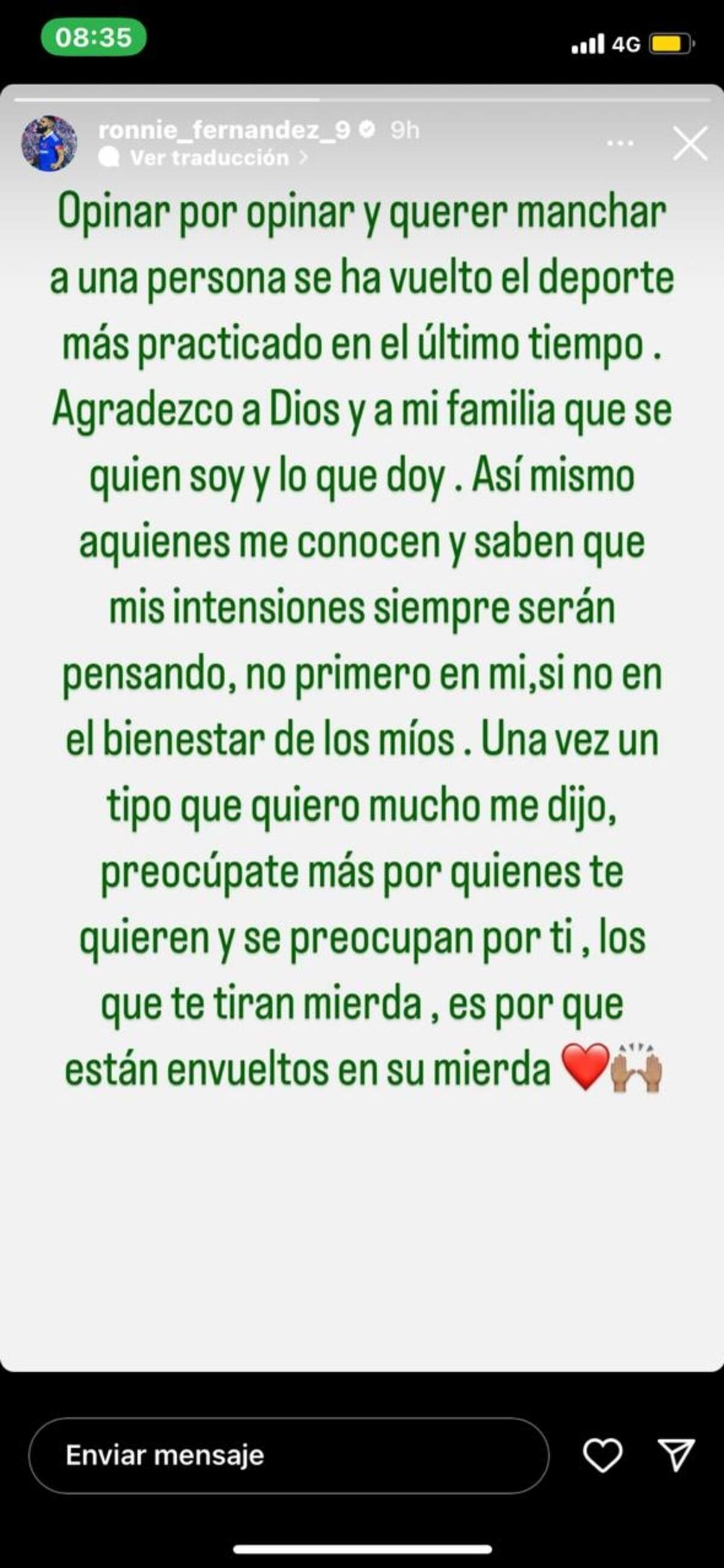 Finalmente, Ronnie Fernández cerró su mensaje con una reflexión que tenía en su memoria hace años atrás. "Una vez un tipo que quiero mucho me dijo, preocúpate más por quienes te quieren y se preocupan por ti, los que te tiran mierda, es porque están envueltos en su mierda", sentenció.