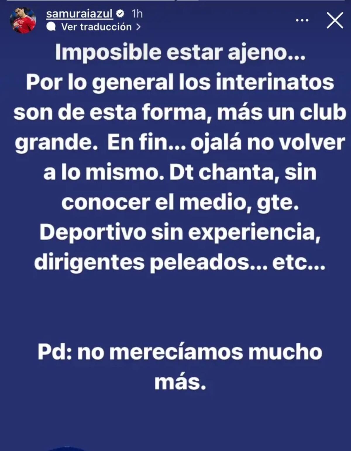 "Imposible estar ajeno... Por lo general los interinatos son de esta forma, más en un club grande. En fin... ojalá no volver a lo mismo, DT chanta, sin conocer el medio, gerente deportivo sin experiencia, dirigentes peleados, etc. PD: no merecíamos mucho más", expresó el ídolo de Universidad de Chile.