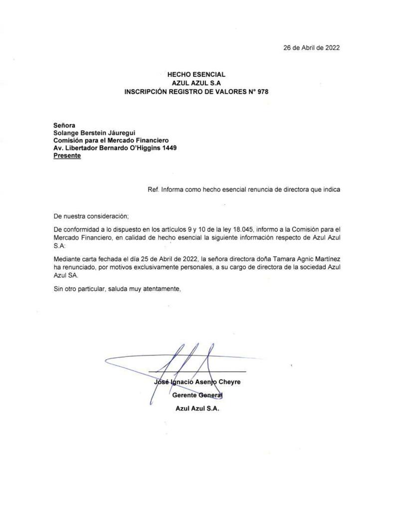 "Mediante carta fecha el 25 de abril de 2022, la señora directora Tamara Agnic Martínez ha renunciado, por motivos exclusivamente personales a su cargo de directora de la sociedad Azul Azul S.A", detalló el escrito publicado en la CMF este martes 26 de abril.