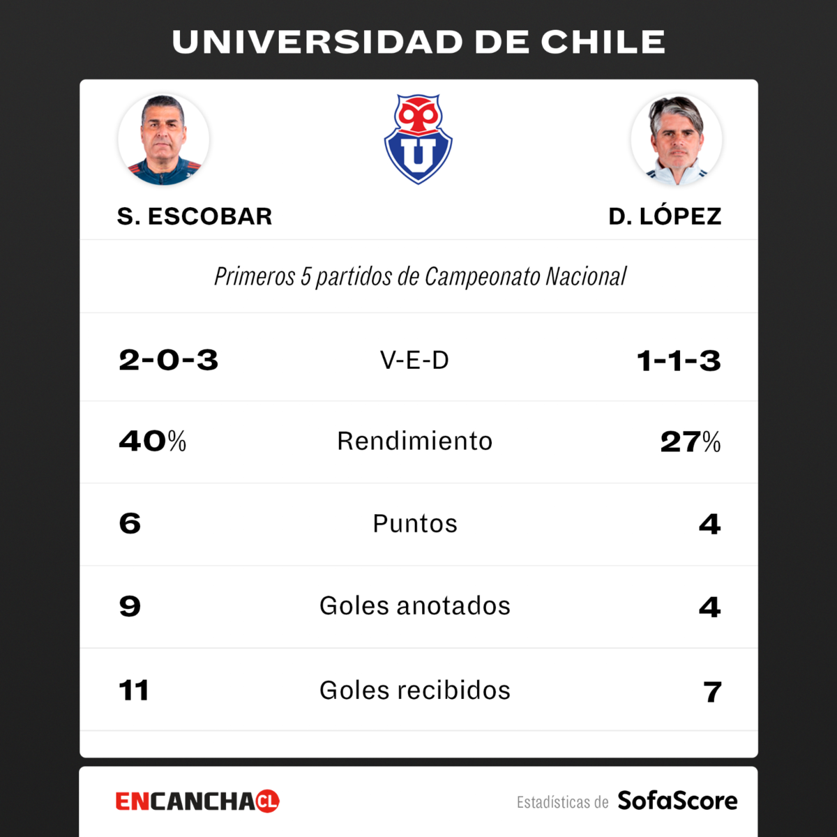 Este rendimiento es mucho menor al que tuvo el DT colombiano Santiago Escobar a inicios de temporada con los azules y contra los mismos rivales, quien en los cinco primeros partidos hasta el Superclásico que le tocó dirigir, consiguió dos triunfos consecutivos y tres derrotas al hilo, promediando un 40%.