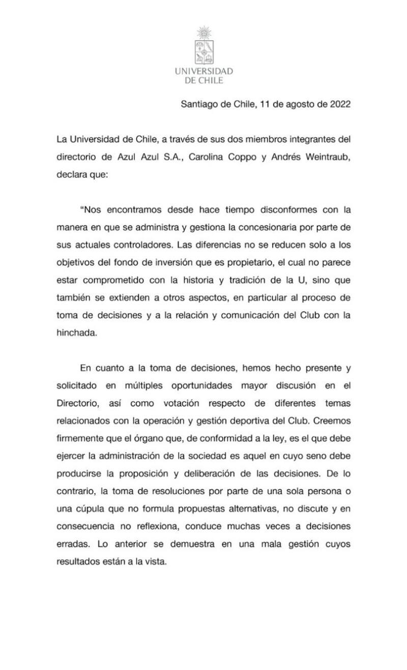 Carolina Coppo y Andrés Weintraub, representantes de la Casa de Estudios en el directorio en la concesionaria, se lanzaron en picada en contra del manejo de Michael Clark en la Universidad de Chile, y pidieron cambios a través de una carta para revertir el complicado momento que atraviesa el club, tanto en lo deportivo como en lo administrativo.