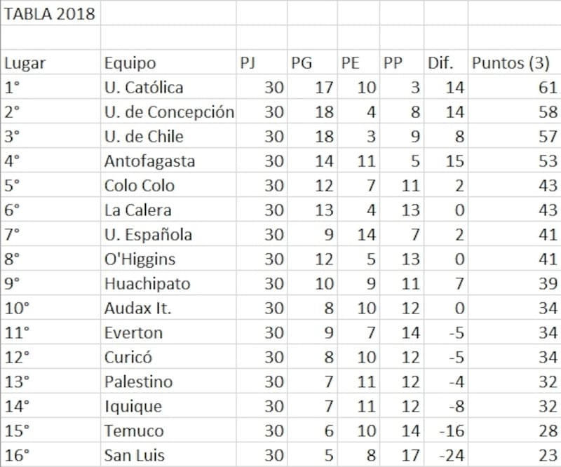 El último campeonato que tuvo 16 clubes (2018), el campeón fue Universidad Católica con 61 unidades. Ese año, Deportes Temuco y San Luis con 23 y 28 puntos, respectivamente, se fueron a Primera B. ¿Qué equipos estaban más arriba? Curicó Unido (34), Palestino (32) y Deportes Iquique (32). Es decir, ahí estaba la frontera para poder salvarse.