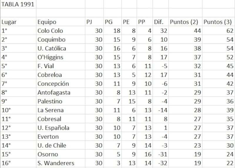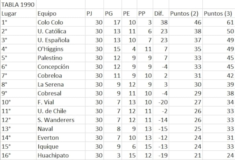 En su vuelta a Primera División, en 1990, los equipos descendidos fueron Deportes Iquique (24) y Huachipato (21). Claro que con el formato actual, y por cantidad de victorias, los norteños habrían obtenido 33 unidades, teniendo que jugar la Liguilla de Promoción. El equipo que habría bajado sería Everton con 31. Ese año, la U tuvo la misma campaña que cuando descendió y sacó 26 unidades. Y en la realidad actual son 33 puntos.