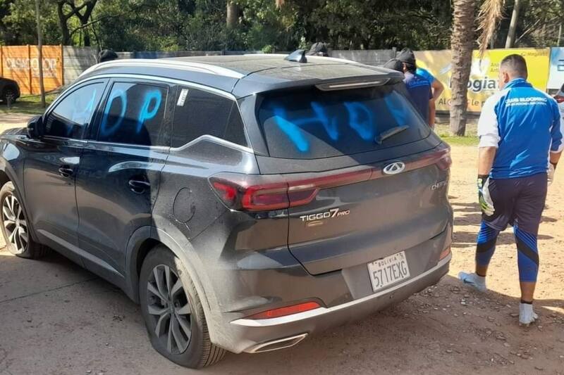 Una decena de automóviles -entre las que no se detalló los nombres de los dueños- estacionados y que corresponden a jugadores del plantel, fueron rayados con distintas consignas, entre ellas la de "flojos". A su vez, los neumáticos de los vehículos de los futbolistas de Blooming fueron pinchados. No se consignó si Carrasco fue uno de los afectados.