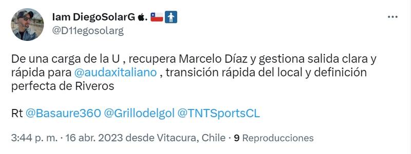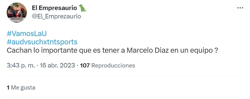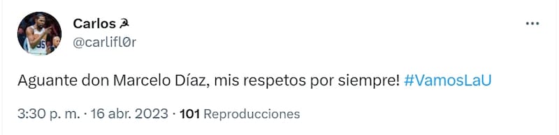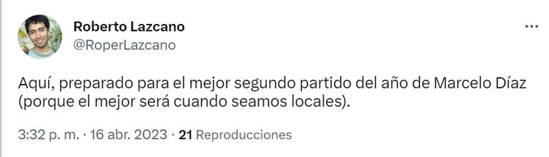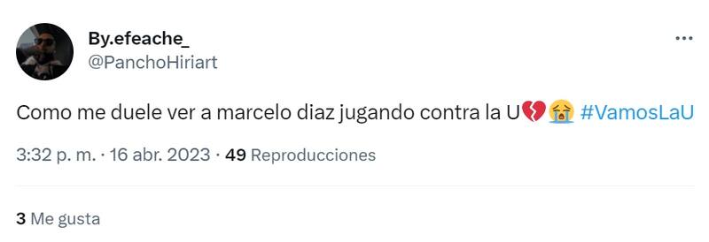 En Twitter, los simpatizantes de la U llenaron de elogios a Marcelo Díaz y expresaron su desazón por no volver a verlo con la camiseta azul. Los comentarios aludieron al gran desempeño del mediocampista central durante los primeros minutos y su aporte en la apertura del marcador en La Florida.