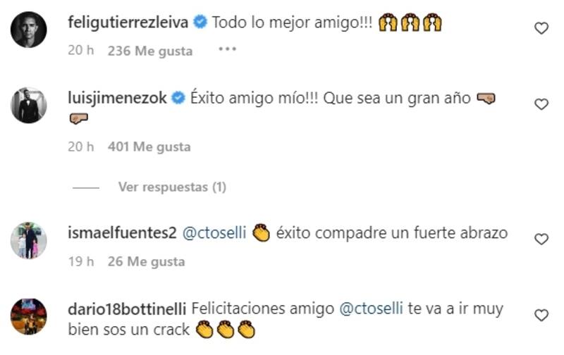 Otros que llegaron a la publicación del nuevo portero de la U fueron, precisamente, compañeros que tuvo en la UC. Figuras como Darío Botinelli, Felipe Gutiérrez y Juan Carlos Espinoza dijeron presentes en la foto de Toselli, futbolistas que también fueron acompañados por Luis "Mago" Jiménez e Ismael "Chupallita" Fuentes en los comentarios.