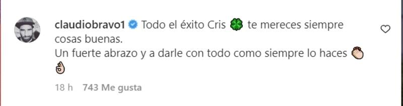 Luego de que Toselli publicara su primera foto con la camiseta de la U, nombres como Bravo le comentaron sus deseos al portero que jugó en Central Córdoba de Argentina. "Todo el éxito, Cris. Te mereces siempre cosas buenas", fueron las palabras del capitán de La Roja.