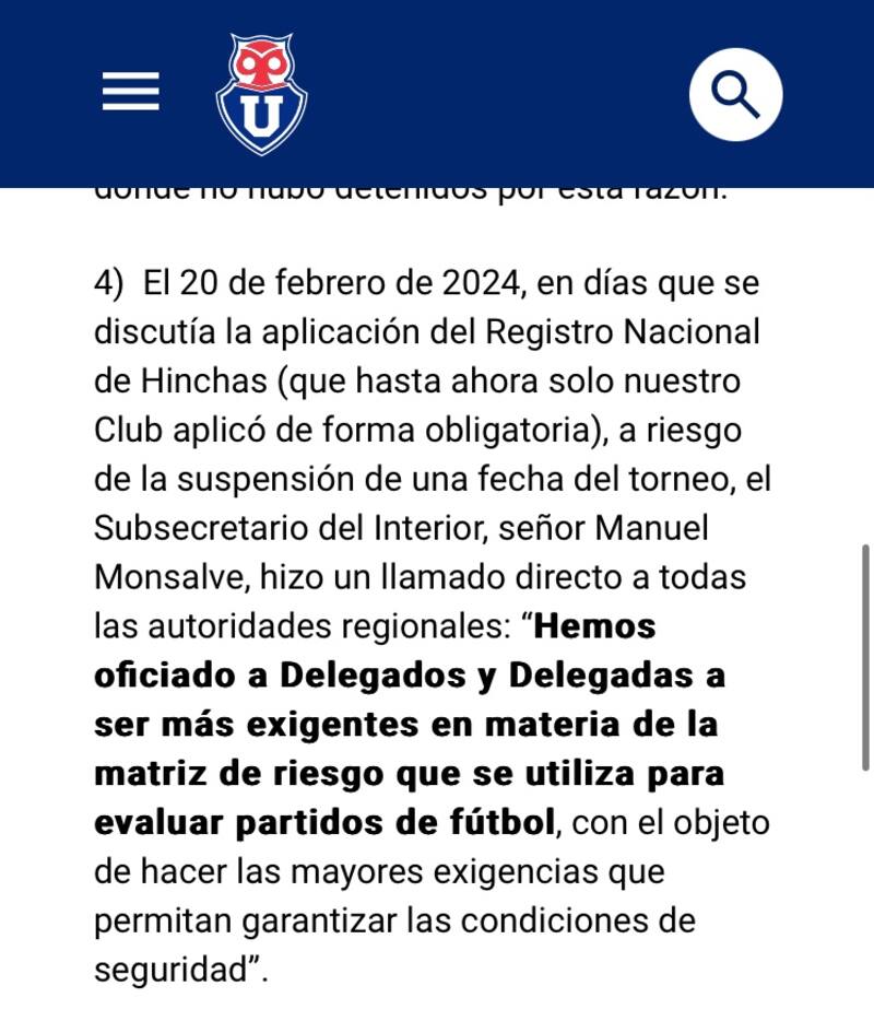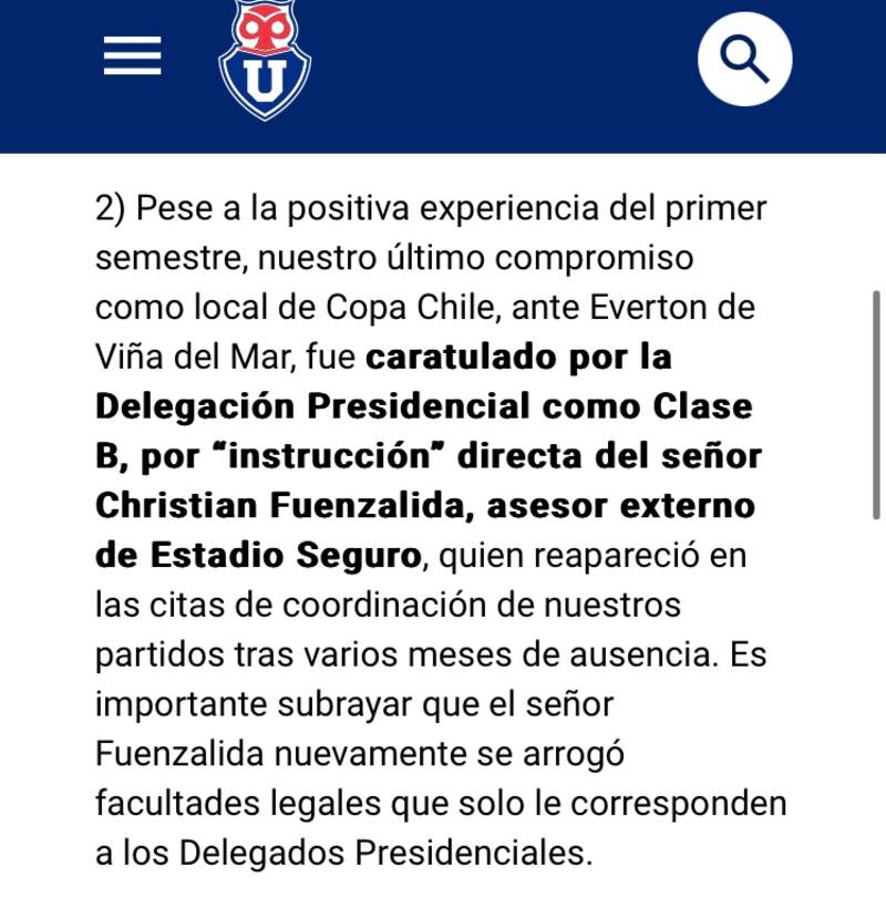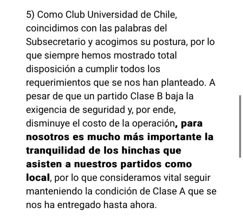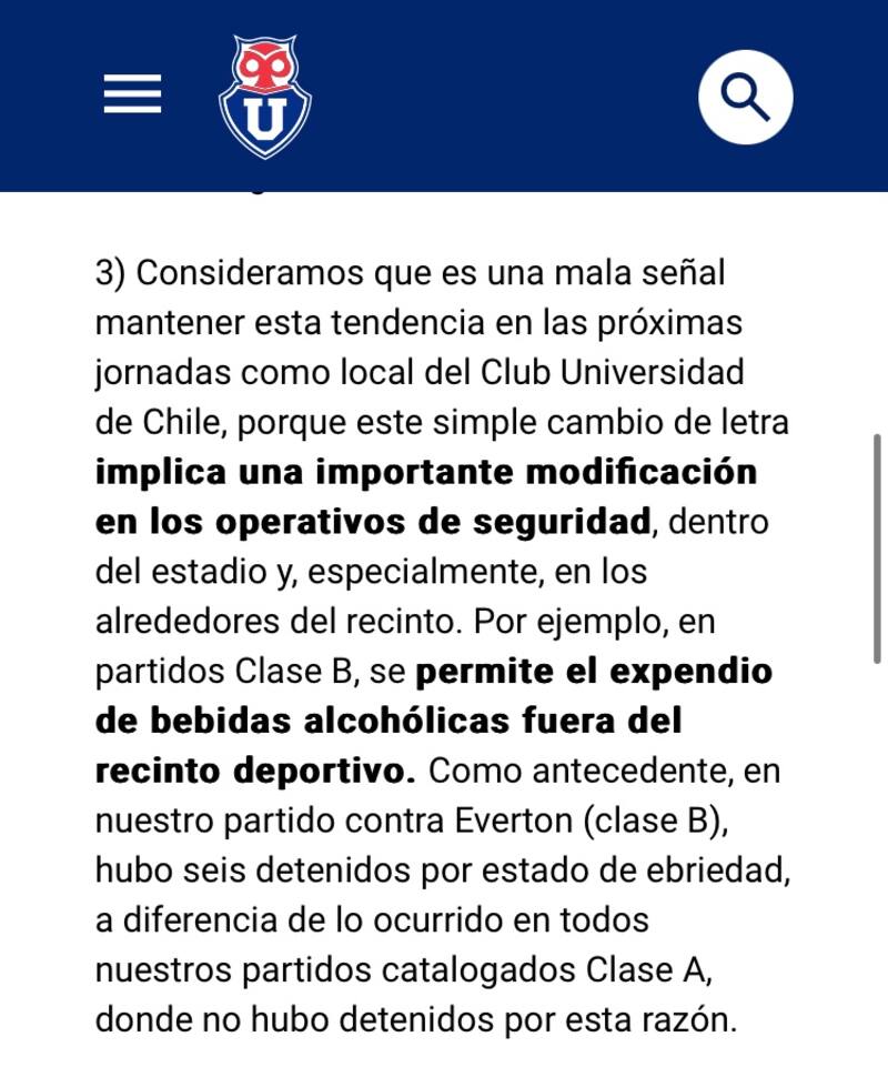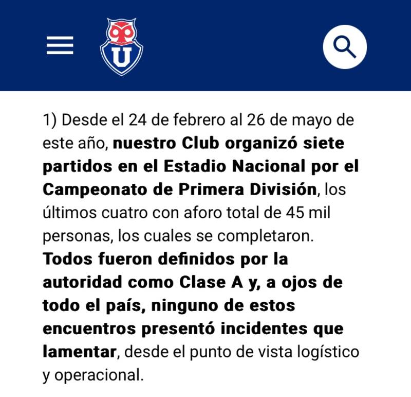 Universidad de Chile destaca que en todos los duelos anteriores que hicieron de local, se solicitó aforos de 45 mil espectadores y que en ninguno hubo problemas de seguridad, por lo que desde la dirigencia instaron a la Delegación Presidencial y las autoridades en general a reconsiderar la categorización de los partidos.