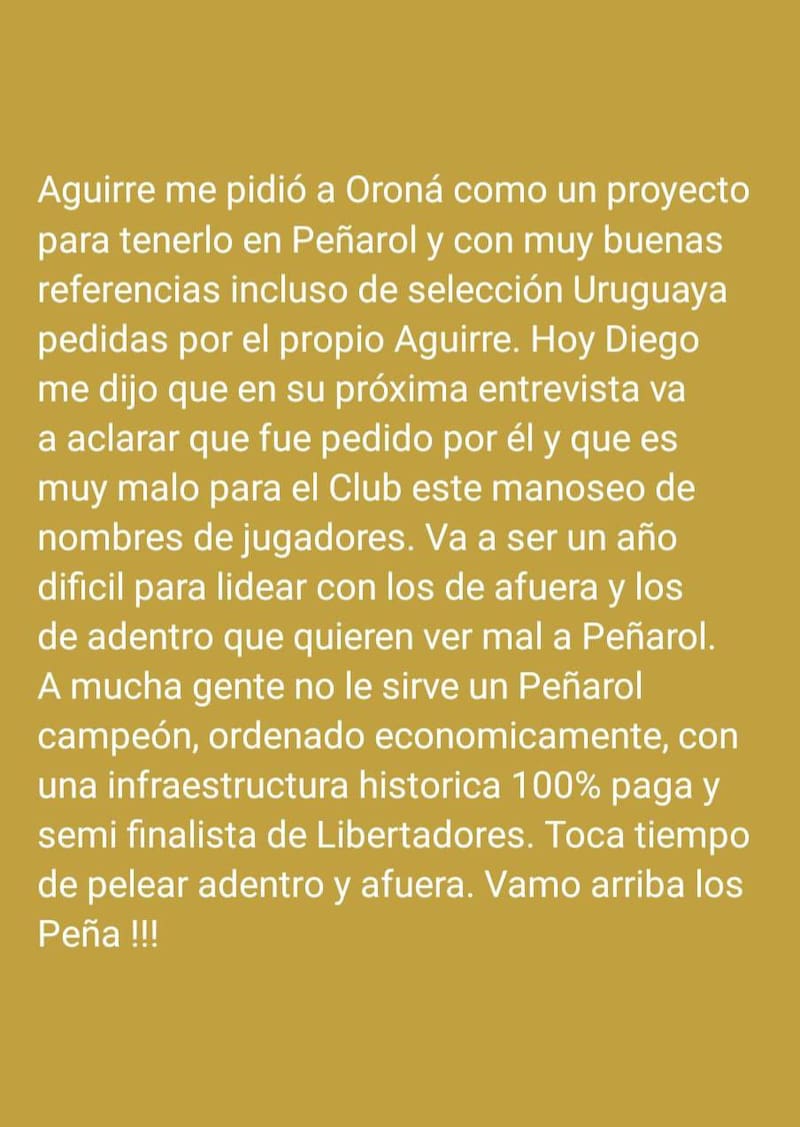 “(Diego) Aguirre pidió a Oroná como un proyecto para tenerlo en Peñarol y con muy buenas referencias incluso de selección uruguaya pedidas por el propio Aguirre”, comenzó diciendo el mandamás.