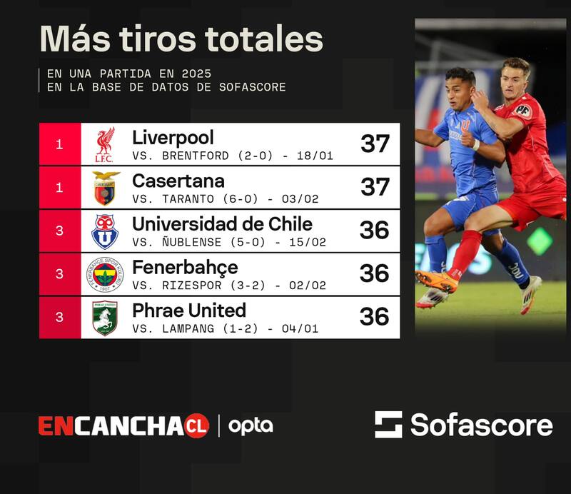 Sí, del Liverpool. Pero el de Inglaterra, ¿eh? No el de Montevideo ni de ninguna otra parte. Los 36 remates totales que Universidad de Chile registró ante Ñublense ubicaron al elenco de Gustavo Álvarez en el segundo lugar en esa categoría, a nivel mundial, en lo que va del año.