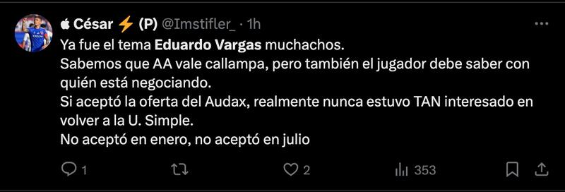 Por otro lado, hay un sector que critica al propio Vargas. Recuerdan que a comienzos de año optó por irse a Nacional en lugar de volver a la U, y ahora cuestionan su real intención de regresar.