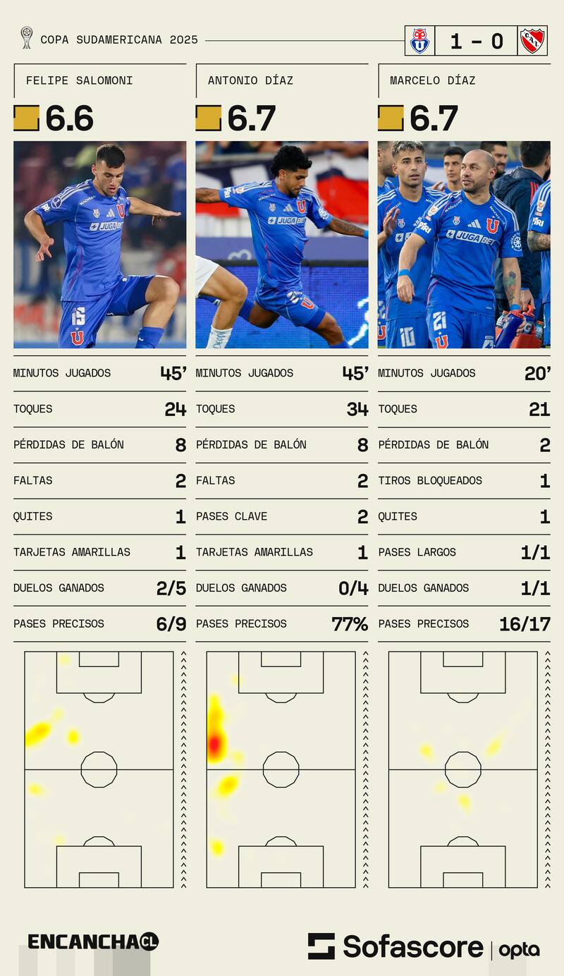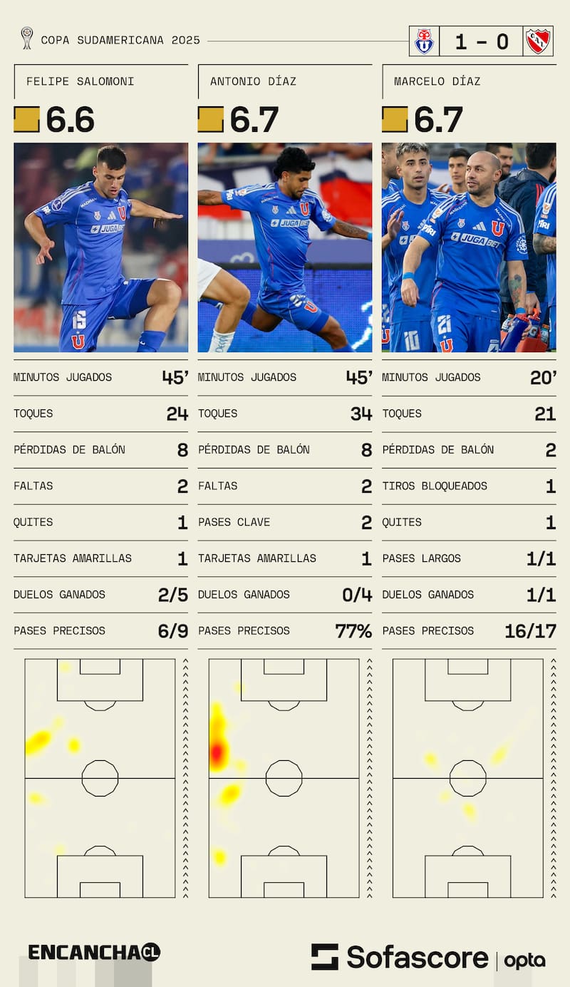 Sofascore entregó las calificaciones y entre los más bajos aparecen Felipe Salomoni, Antonio Díaz y Marcelo Díaz. Estos dos últimos ingresaron en el segundo tiempo y no lograron envalentonar al equipo a ir por el segundo tanto.