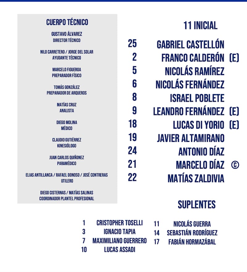El once titular de la U será: Gabriel Castellón; Nicolás Ramírez, Franco Calderón y Matías Zaldivia; Nicolás Fernández, Marcelo Díaz, Israel Poblete, Antonio Díaz y Javier Altamirano; Lucas Di Yorio y Leandro Fernández.