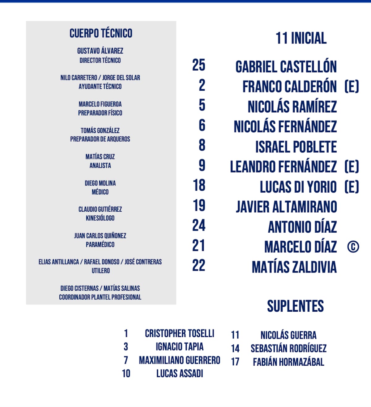 El once titular de la U será: Gabriel Castellón; Nicolás Ramírez, Franco Calderón y Matías Zaldivia; Nicolás Fernández, Marcelo Díaz, Israel Poblete, Antonio Díaz y Javier Altamirano; Lucas Di Yorio y Leandro Fernández.