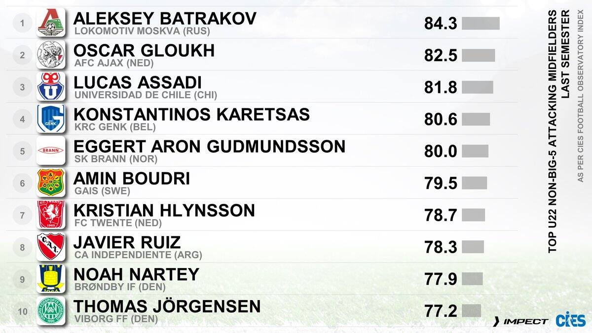 Puntea este escalafón el ruso Aleksei Batrakov (Lokomotiv de Muscú), quien alcanzó un promedio de 84.3, seguido por el israelí Oscar Gloukh, de Ajax de Ámsterdam, con 82.5.