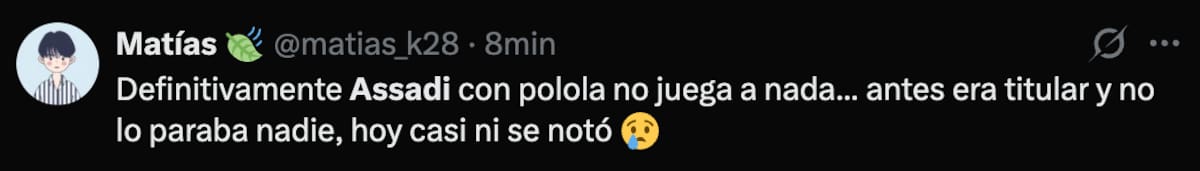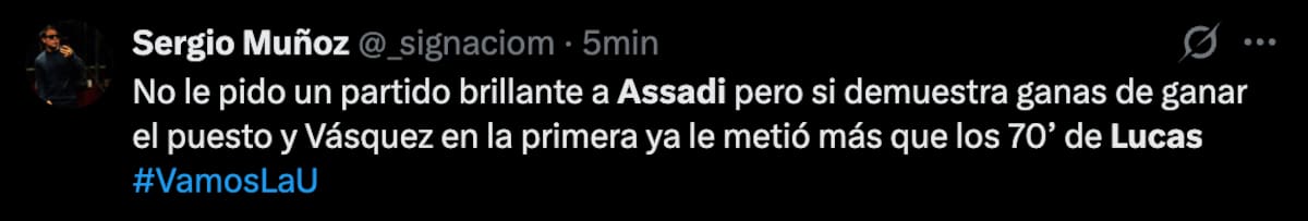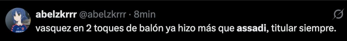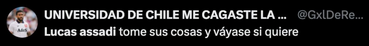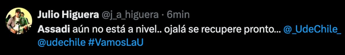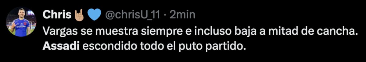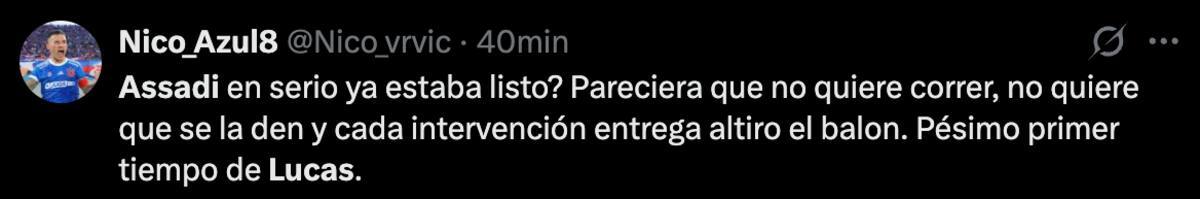 Mientras el encuentro se desarrollaba en tierras chillanejas, los hinchas del Romántico Viajero utilizaron sus redes sociales para cuestionar el actual nivel de Lucas Assadi, quien, a ojos de los seguidores, no regresó de buena manera después de su lesión.