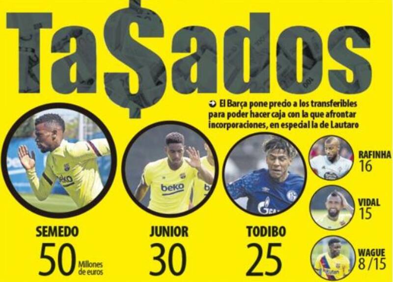 En esta ocasión, Mundodeportivo titula en su portada del miércoles: "Tasados", y añade: "El Barca pone precio a los transferibles para poder hacer caja con la que afrontar incorporaciones, en especial la de Lautaro".