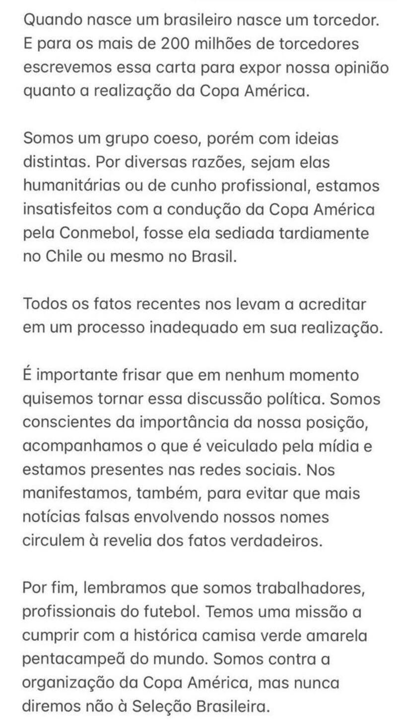 "Recordamos que somos trabajadores, profesionales del fútbol. Tenemos una misión que cumplir con la histórica camiseta verde y amarilla pentacampeona del mundo. Estamos en contra de la organización de la Copa América, pero nunca le diremos que no a la Selección Brasileña", sentenciaron en el escrito difundido en redes sociales.