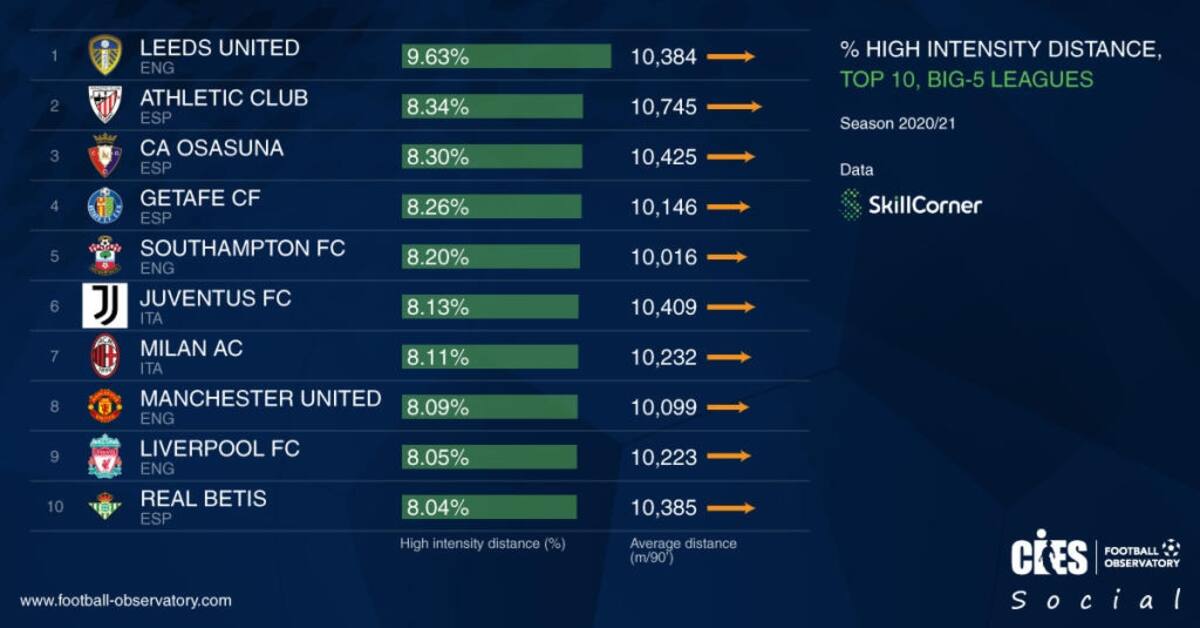 El top 5 de intensidad lo completa el Athletic de Bilbao, el Osasuna, el Getafe y el Southampton. ¿Y el Betis de Pellegrini? Se ubica décimo, con un 8,04% del partido siendo intenso, superado levemente por elencos poderosos como el Liverpool, Manchester United, AC Milán y Juventus.