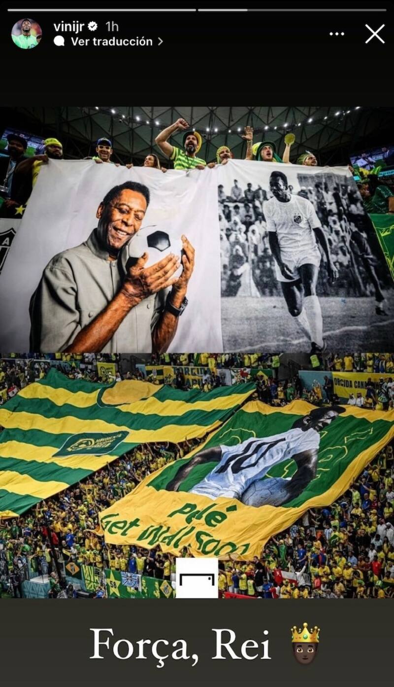 Al respecto, son varias de las figuras a nivel mundial que han mostrado preocupación. Uno de ellos es Vinicius Junior, quien desde la concentración de Brasil en el Mundial de Qatar 2022 le dedicó un mensaje al otrora delantero. El extremo del Real Madrid subió una foto con el homenaje que le dedicó la parcialidad brasileña a Pelé en el duelo ante Camerún, con un mensaje que dice "Força, Rei".