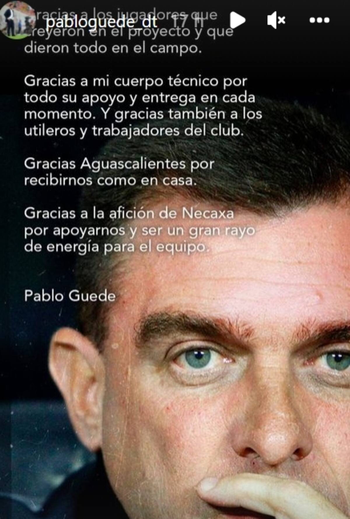 "A todos los jugadores que creyeron en el proyecto y dieron todo en el campo. Gracias a mi cuerpo técnico por todo su apoyo y entrega en cada momento. Y gracias también a los utileros y trabajadores del club. Gracias Aguascalientes por recibirnos como en casa. Gracias a la afición del Necaxa por apoyarnos y ser un gran rayo de energía para el equipo", escribió el DT.