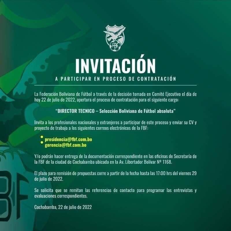 "La Federación Boliviana de Fútbol a través de la decisión tomada en Comité Ejecutivo el día de hoy 22 de julio de 2022, apertura el proceso de contratación para al siguiente cargo: director técnico", señala el comunicado de la escuadra que finalizó novena en las Eliminatorias rumbo a la cita planetaria.