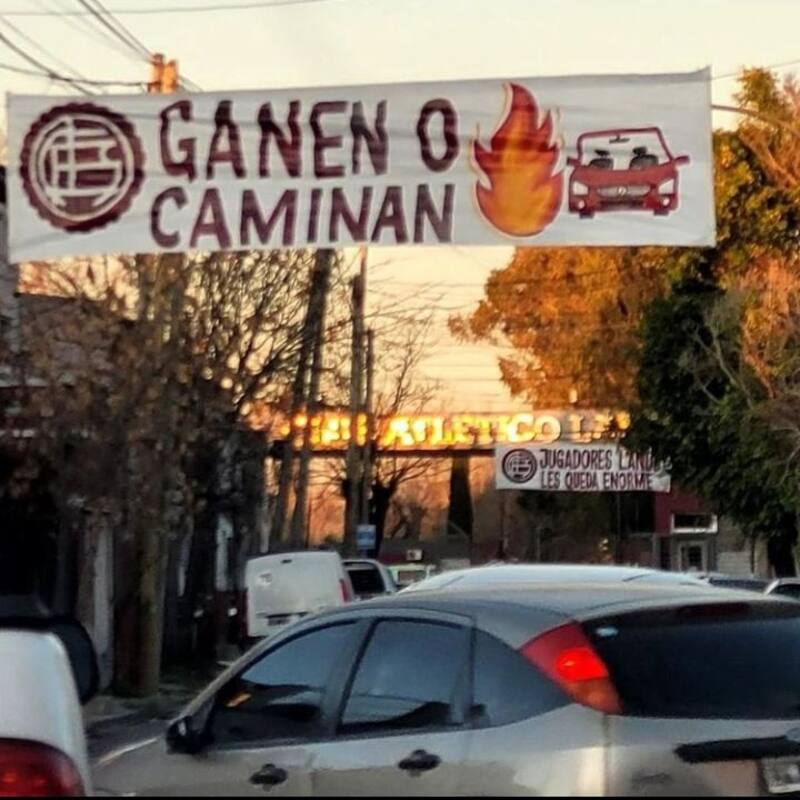 "Ganen o caminen", es uno de los mensajes en los pasacalles que apareció en las inmediaciones del club de la Zona Sur de Buenos Aires, recordando el repudiable incidente de hace unos días con hinchas de Aldosivi, que incendiaron cinco autos de jugadores del plantel profesional.