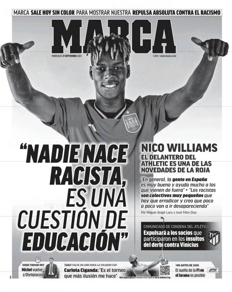 Uno de los diarios deportivos más respetados de Europa se sumó a las manifestaciones antirracistas con un notable gesto en su edición de este miércoles: todas las páginas del Diario Marca de hoy están impresas en blanco y negro, en una demostración, según la propia editorial del medio, que pretende mostrar "La más absoluta repulsa contra el racismo tanto en el deporte como en la sociedad".