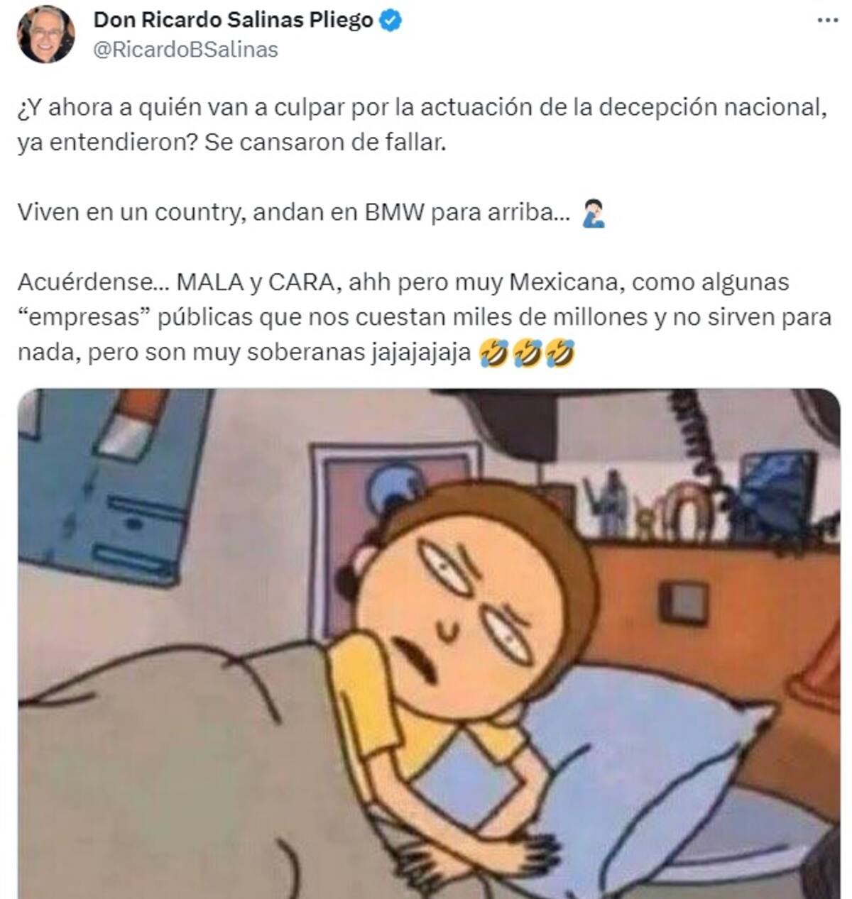 “¿Y ahora a quién van a culpar por la actuación de la decepción nacional, ya entendieron? Se cansaron de fallar. Viven en un country, andan en BMW para arriba. Acuérdense... MALA y CARA, ahh, pero muy Mexicana, como algunas “empresas” públicas que nos cuestan miles de millones y no sirven para nada, pero son muy soberanas jajajajaja”, sentenció.