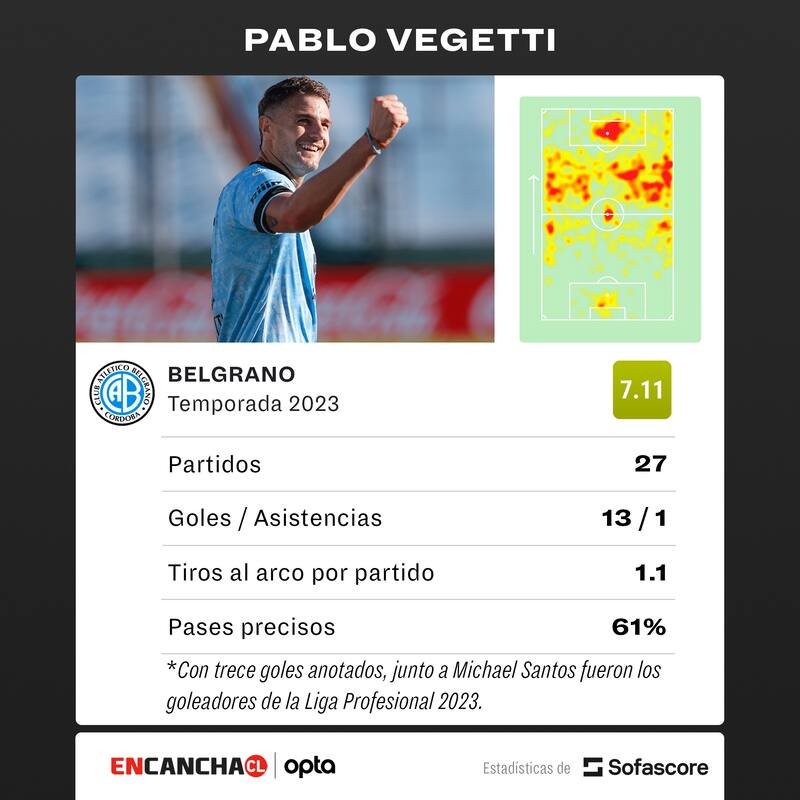 El punto de inflexión en la carrera del atacante fue en 2018/19, cuando firmó en Instituto de Córdoba. A partir de allí, Vegetti siempre ha terminado los torneos con cifras de dos dígitos. Anotó 15 goles en el Ascenso de ese año y luego, desde que llegó a Belgrano, se ha matriculado consecutivamente con 17, 16, 17 y 10 tantos.