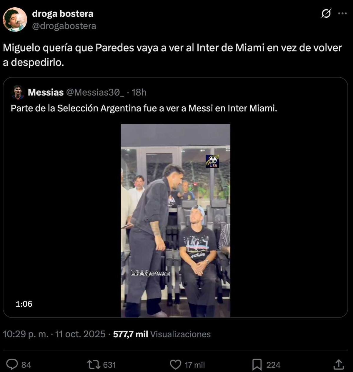 Algo que escaló este sábado con el mediocampista pasándolo de lo más bien junto a sus compañeros viendo a Messi. No hubo tiempo para volver a su país a rendirle sus respetos a Miguel Ángel, pero sí para ir a aplaudir a Leo.